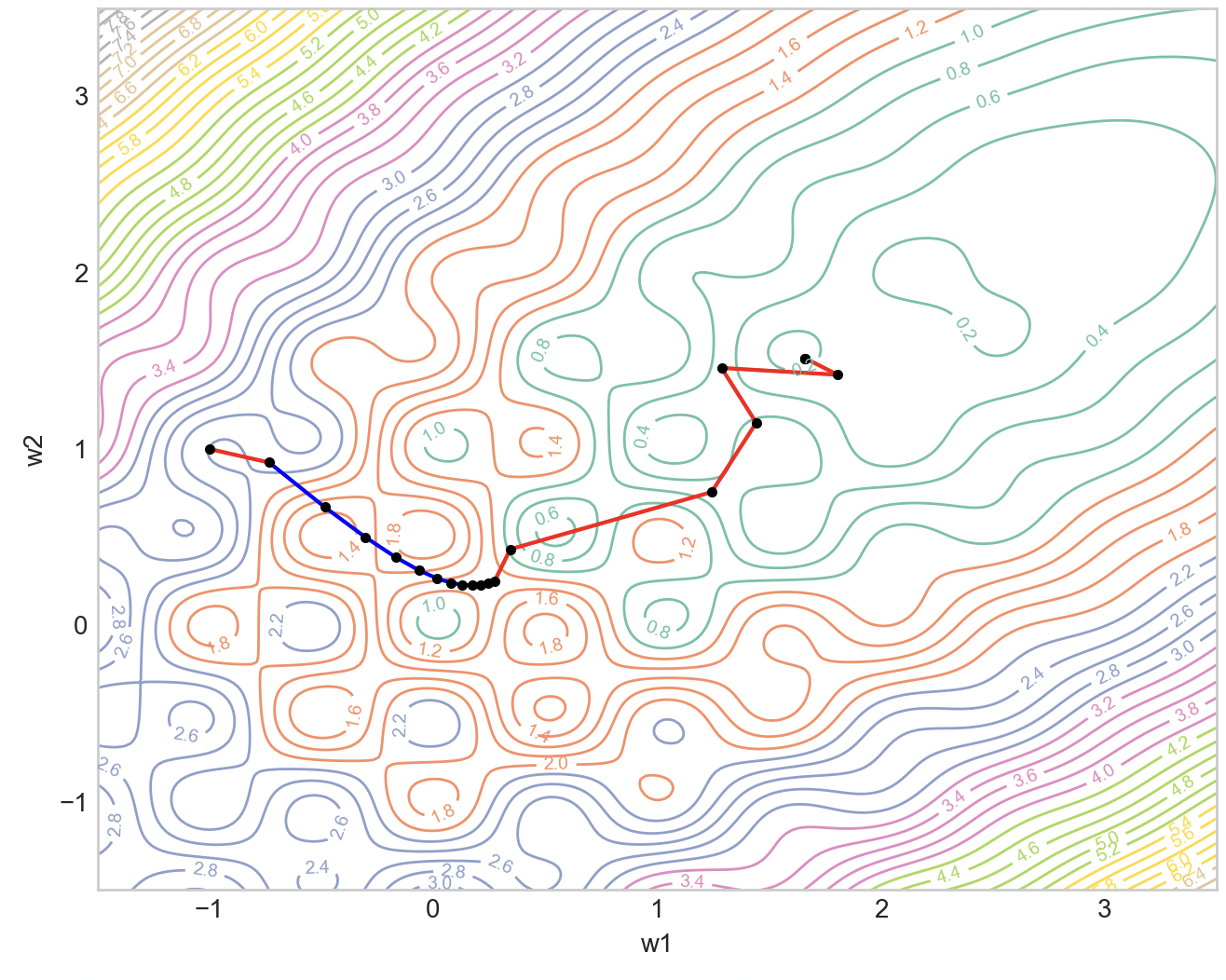 Let , . Then, we use this as our substitute gradient in our optimization to obtain the left image below, where the blue segments are steps where and red when vice versa. The right image is when we randomly weight the gradients from easy and hard to mimic to stochastic minibatch sampling. We can see that the guided optimization does take a more direct path.