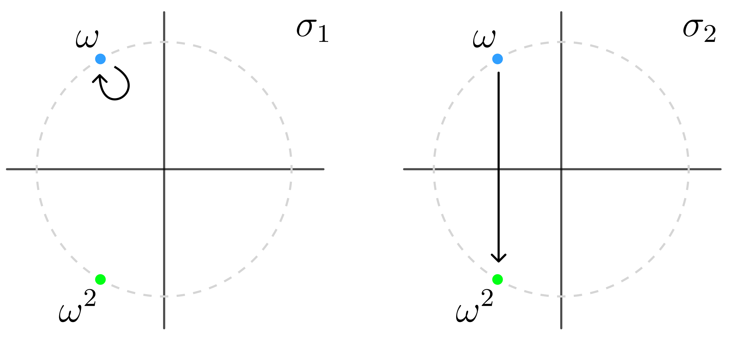 We get a rotation looking group. In fact, $\text{Aut}(\mathbb{Q}(\omega) / \mathbb{Q}) \cong C_2$ and $\text{Aut}(\mathbb{Q}(\omega, \sqrt[3]{3}) / \mathbb{Q}(\omega)) \cong C_3$. Its tempting to think that finally we can figure out the group structure for $\text{Aut}(\mathbb{Q}(\omega, \sqrt[3]{3}) / \mathbb{Q})$ by taking the direct product $\text{Aut}(\mathbb{Q}(\omega) / \mathbb{Q}) \times \text{Aut}(\mathbb{Q}(\omega, \sqrt[3]{3}) / \mathbb{Q}(\omega))$. However this is not correct because these groups interact with eachother in a non-trivial way - we can't compose their automorphisms in any order, that would change the output (try it out). Instead we need to follow a fixed order, where we perform the reflection $(\text{Aut}(\mathbb{Q}(\omega) / \mathbb{Q}) \cong C_2)$ and then follow with the rotation $(\text{Aut}(\mathbb{Q}(\omega, \sqrt[3]{3}) / \mathbb{Q}(\omega))\cong C_3)$. This can be written using the semi-direct product notation $\rtimes$: $$\text{Aut}(\mathbb{Q}(\omega, \sqrt[3]{3}) / \mathbb{Q}) \cong \text{Aut}(\mathbb{Q}(\omega, \sqrt[3]{3}) / \mathbb{Q}(\omega)) \rtimes \text{Aut}(\mathbb{Q}(\omega) / \mathbb{Q})$$