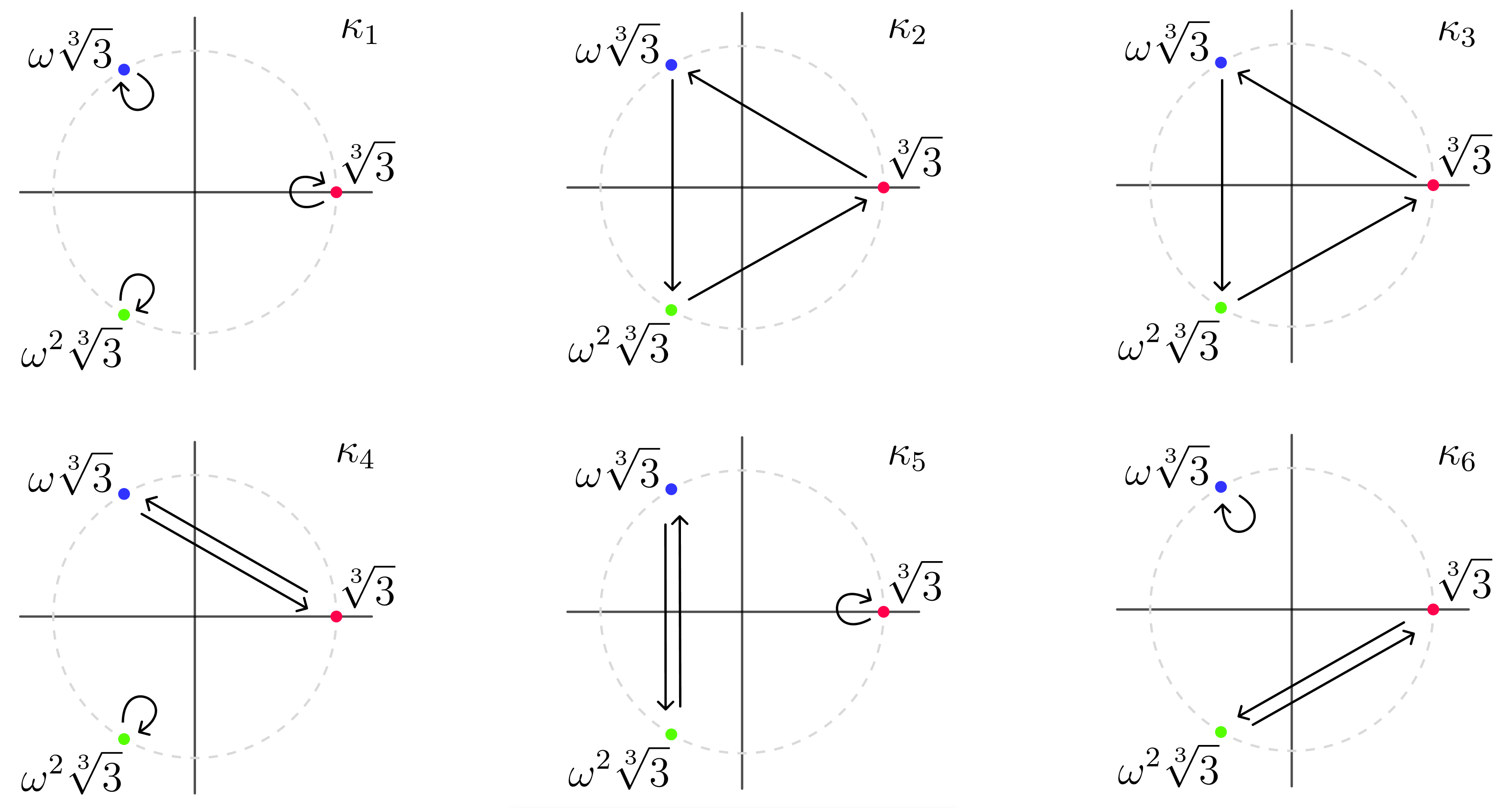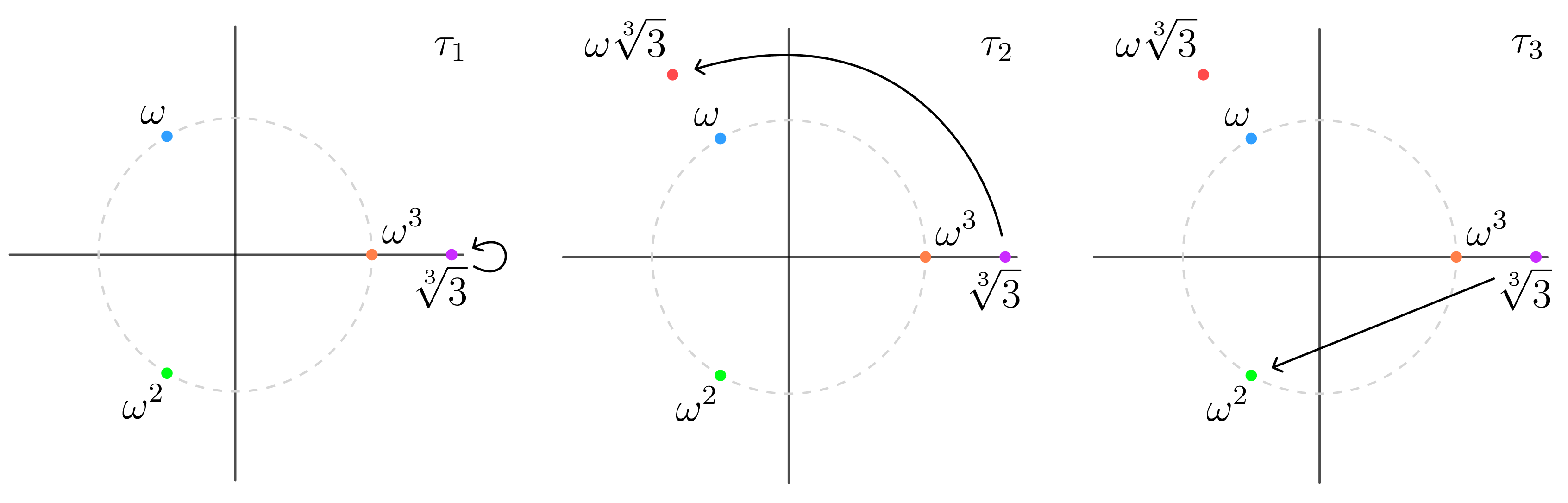Here are the roots plotted in the complex plane, notice that they are on the perimeter of the circle, that is due to the roots of unity rotating $\sqrt[3]{3}$ around. So now that we know what the roots are, how can we figure out all the valid automorphisms: $\text{Aut}(\mathbb{Q}(\sqrt[3]{3}, \omega) / \mathbb{Q})$. Since our polynomial is small we can figure it out manually by hand, but we can take a more programmatic approach by progressively extending the field. First we consider: $$\text{Aut}(\mathbb{Q}(\omega) / \mathbb{Q})$$